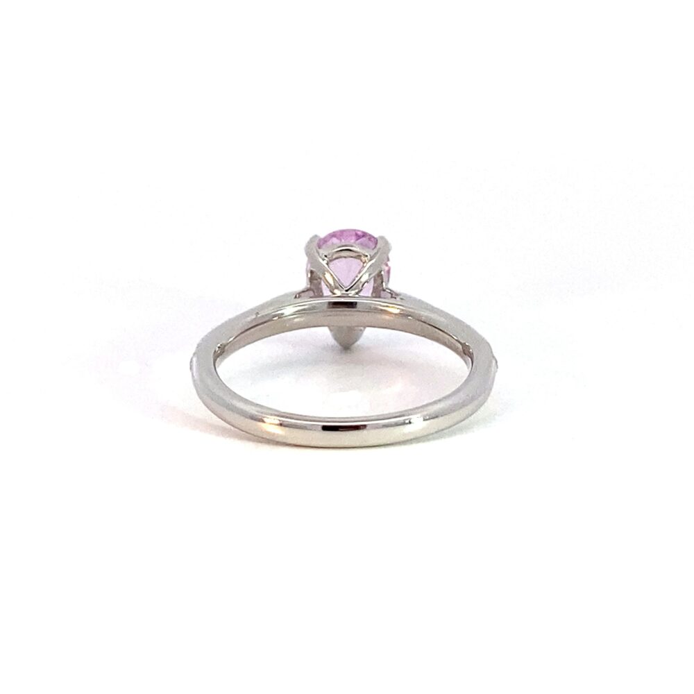 A pink sapphire single-stone dress ring made in platinum. The ring features a D-shaped shank with diamond-set shoulders, set with round brilliant-cut diamonds with a total weight of 0.09ct. At the centre is a 1.61ct pear-shaped pink sapphire, set in a three-claw setting.